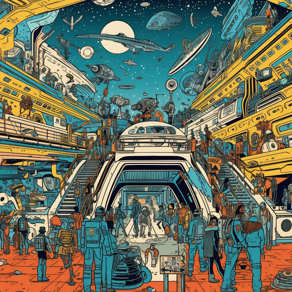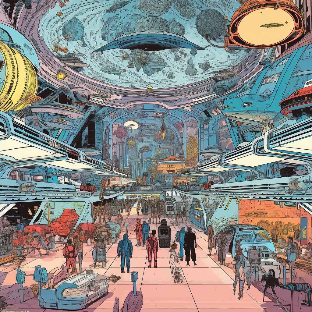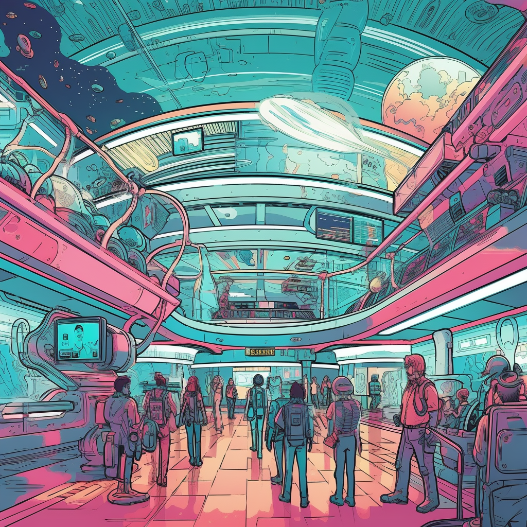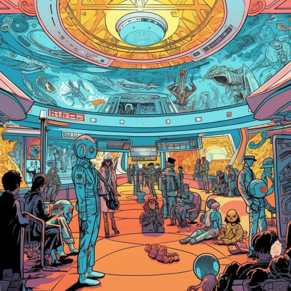 My prompt is "the inside of a futuristic space port bustling with aliens and humans in the style of pop art". I am giving Midjourney a short description of what I want to see as well as guidance on the style that I want it to use.