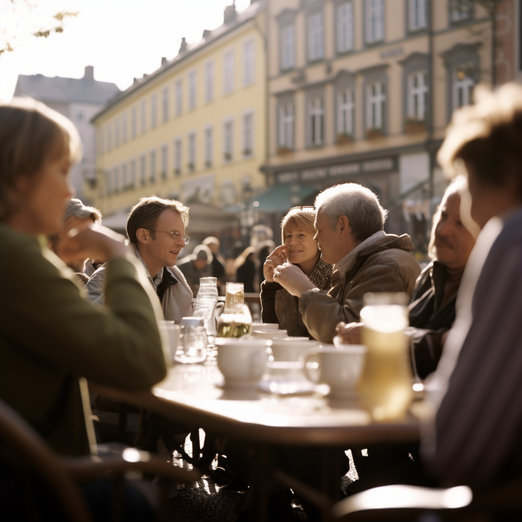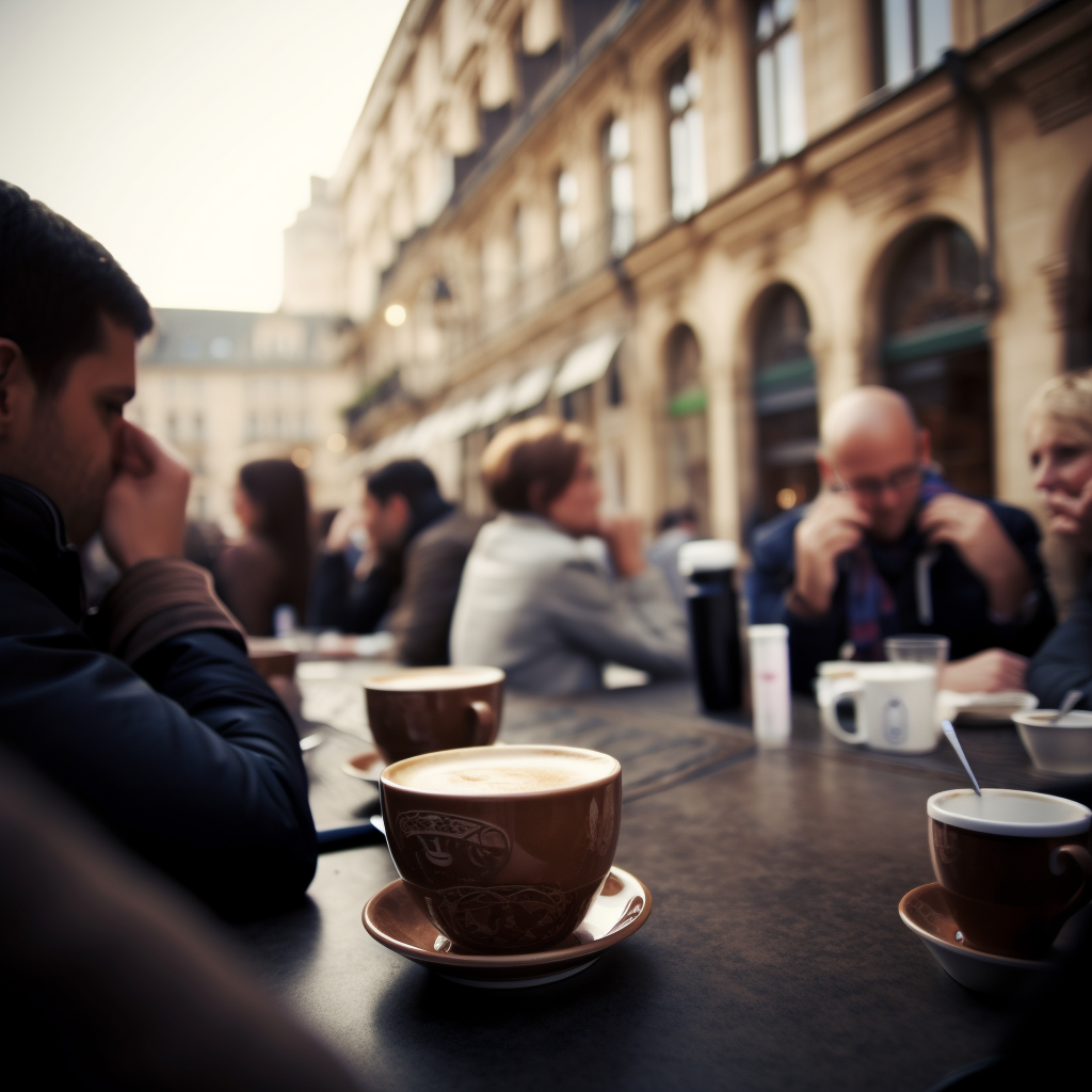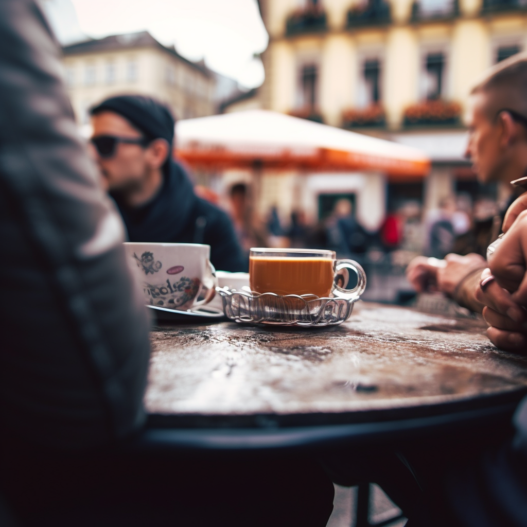 Here are some examples using the prompt of "a photo of at a cafe in a European town square, low angle, telephoto lens".