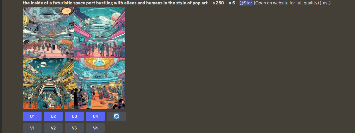 You can then click any of the [U1-U4] buttons to upscale your favorite image, or click the [V1-V4] buttons to generate variations on one of the images.